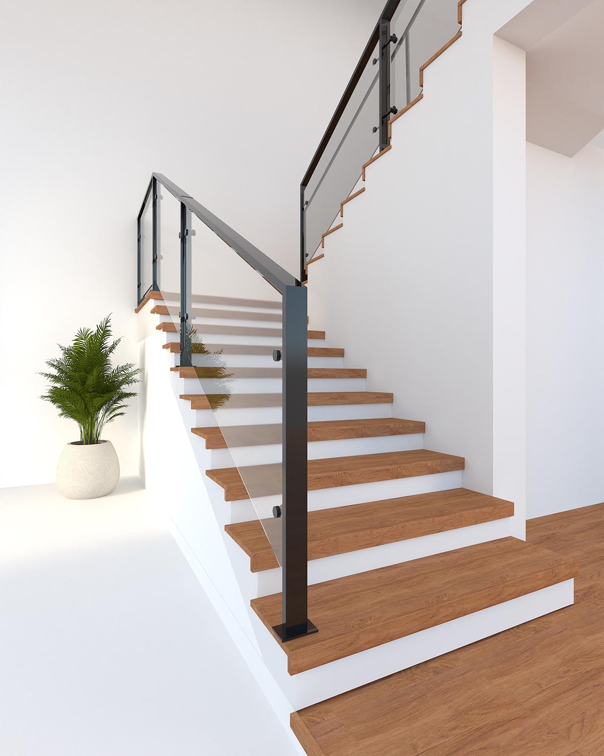 Fixation sur marches (à la française) : Les poteaux sont ancrés directement sur le dessus des marches.